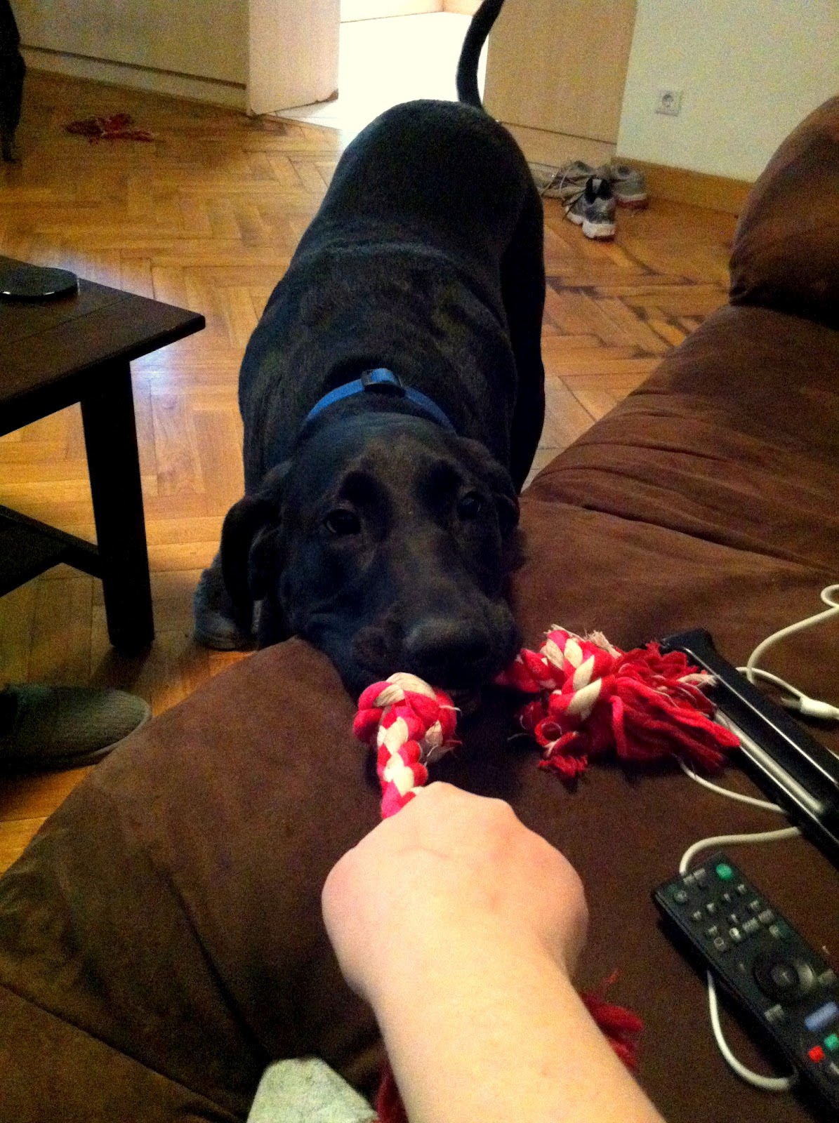 Playing tug of war with Barnacle is a little difficult, since he is over half my size. But, sometimes I let him play. Sometimes.